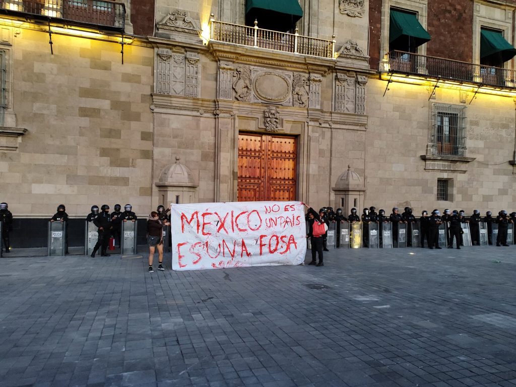 Lo que los medios presentan es exagerado, pues inicialmente solo ingresaron un par de personas con una pancarta en la que se leía: “México no es un país, es una fosa”. Sin embargo, el avance del cuerpo de granaderos, junto con la repentina aparición de al menos cuatro militares en el techo de Palacio y un presunto civil, reavivó el enojo de los manifestantes. Esto provocó que algunos patearan y pintaran los escudos de los granaderos, además de que se lanzaron un par de botellas de agua, aunque la situación no escaló más allá de eso.