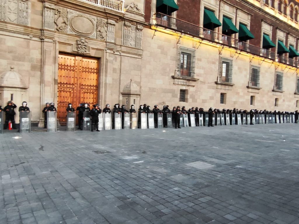 La presencia de los granaderos fue breve en un principio, de aproximadamente 10 minutos, bajo el anochecer que marcaba alrededor de las 6:30. Posteriormente, se desplazaron a la calle de Moneda, a un costado de Palacio Nacional. Sin embargo, la aparición de personas sospechosas con equipos de radiocomunicación y de un grupo de encapuchados fue casi inmediata.