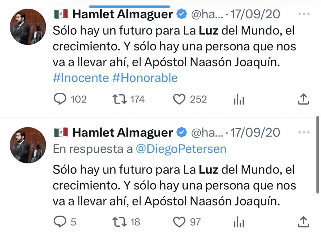 El caso del actual consejero nacional de Morena, Hamlet García Almaguer, es alarmante, pues se trata de un político que ha hecho pública su relación con la iglesia La Luz del Mundo, cuyo líder, Naasón Joaquín, purga una condena de 17 años de prisión en Estados Unidos por los delitos de abuso sexual de menores, trata de personas y pornografía infantil.