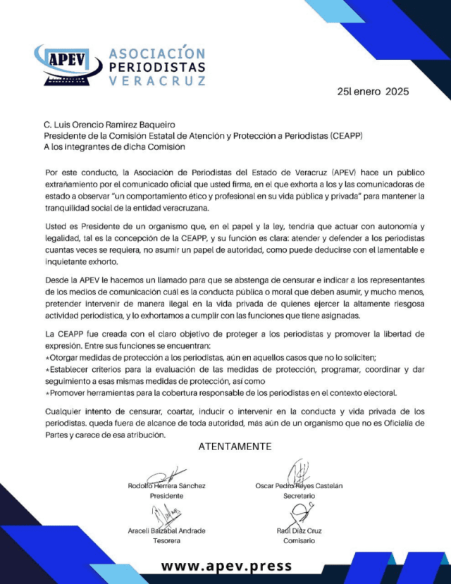 Además, la APEV hizo un llamado para que Ramírez Baqueiro “se abstenga de censurar e indicar a los representantes de los medios de comunicación cuál es la conducta pública o moral que deben asumir, y mucho menos, pretender intervenir de manera ilegal en la vida privada de quienes ejercen la altamente riesgosa labor periodística”.