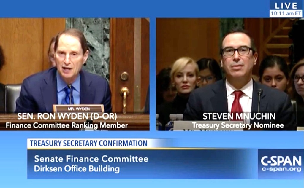 Cuando el presidente Donald Trump nombró para su primera administración a Steven Mnuchin como Secretario del Tesoro, en la Confirmación de su nombramiento, en la Primera Audiencia del Congreso #115 con el Comité de Finanzas del Senado, el Senador Ron Wyden, Finance Committee Ranking Member (Miembro de Mayor Rango del Comité de Finanzas) cuestionó si Mnuchin tendría la capacidad de trabajar a nombre de los Norteamericanos.