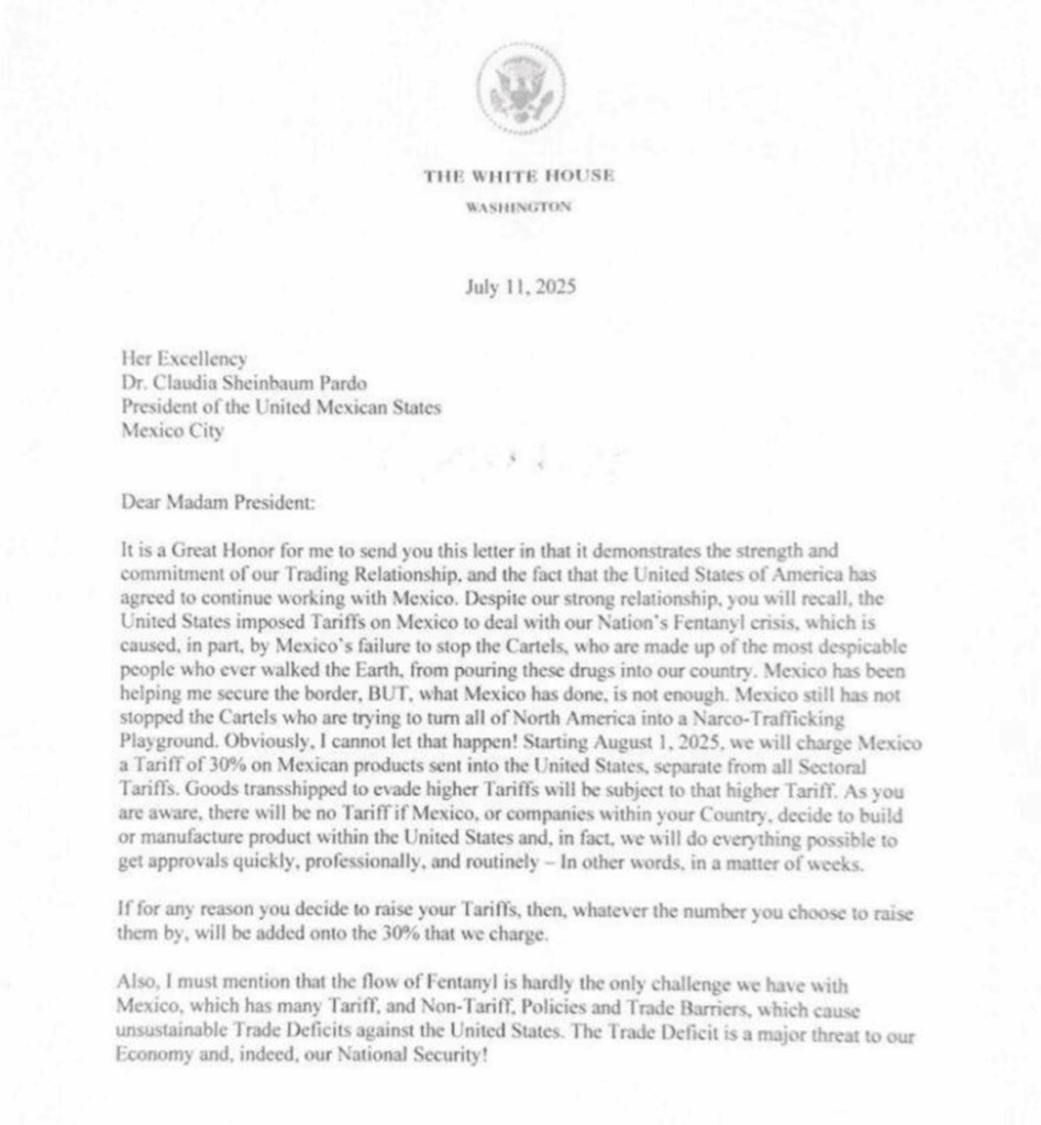 En una carta fechada el 11 de julio, el mandatario estadounidense aseguró que esa medida arancelaria a las importaciones mexicanas responde a que el Gobierno mexicano no ha hecho lo suficiente para detener los cárteles de la droga que introducen fentanilo a Estados Unidos.