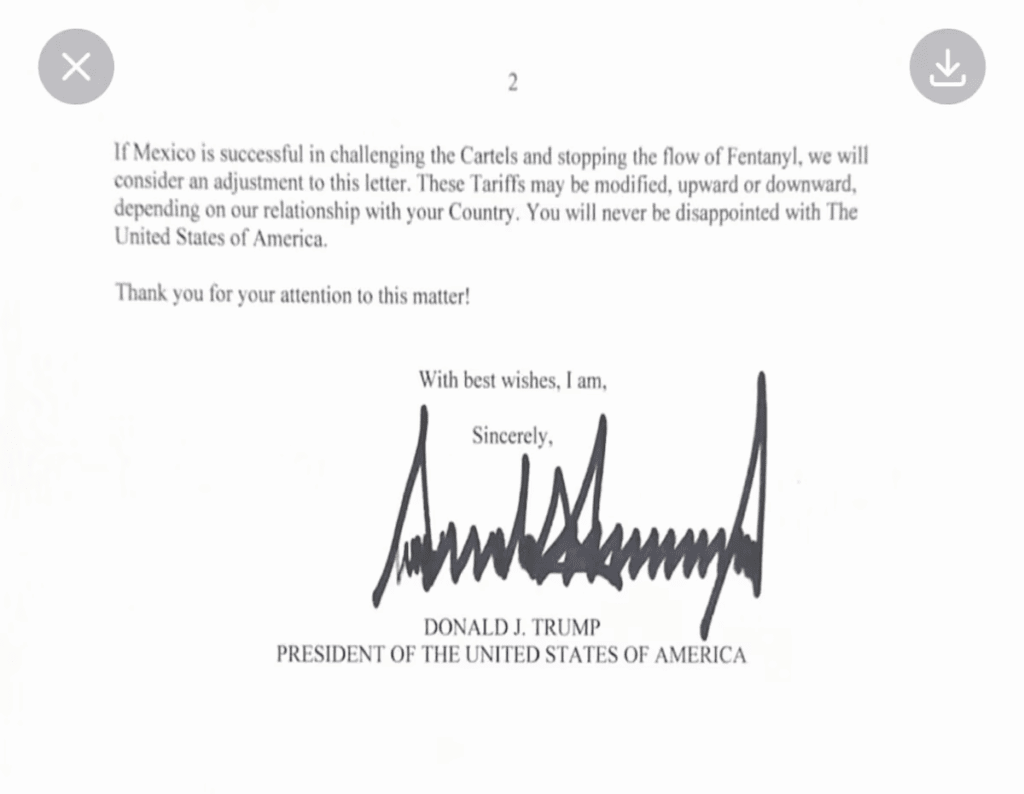 “Si México tiene éxito en enfrentar a los cárteles y detener el flujo de fentanilo, consideraremos hacer un ajuste a esta carta (…) Estas tarifas podrán ser modificadas, hacia arriba o hacia abajo, dependiendo de nuestra relación con su país ”.