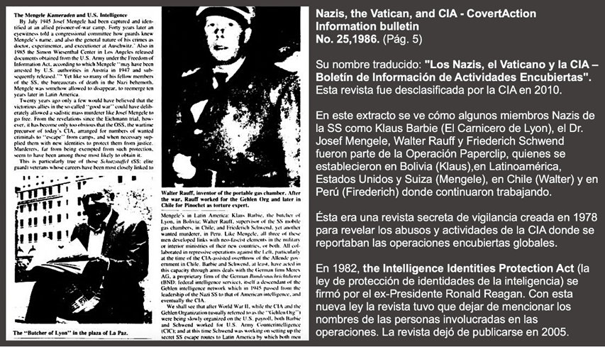Más de 1,600 Nazis e Italianos fascistas fueron introducidos a Sudamérica y a Estados Unidos con pasaportes falsos y con la asistencia del Vaticano (Guardia Suiza) y de la Cruz Roja (Suiza). El propósito de esta migración clandestina era infiltrar la jurisdicción del gobierno Estadounidense, 45 Sociedades Secretas y establecer nuevas agencias de gobierno para continuar con la agenda del Nuevo Orden Mundial, que inició mucho antes de lo que se podría llegar a pensar, y continuar con algunas investigaciones y experimentos de los Nazis en Estados Unidos.