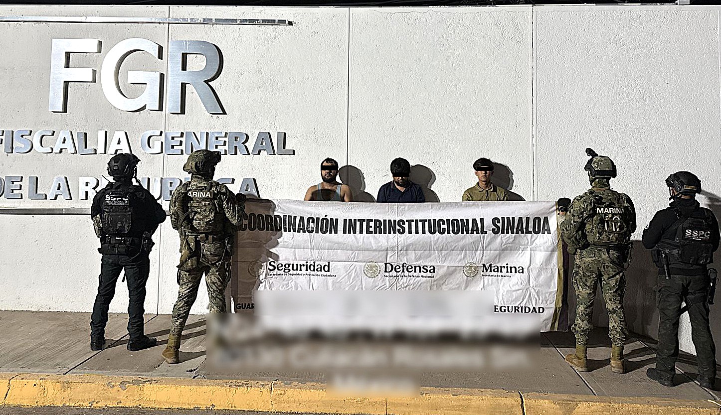 -En Culiacán, elementos de Semar, SSPC, Ejército Mexicano, GN y FGR detuvieron a tres personas, aseguraron dos armas largas, tres armas cortas, cartuchos de diferentes calibres, cargadores, 18 frascos con marihuana, una bolsa con cristal y un vehículo.