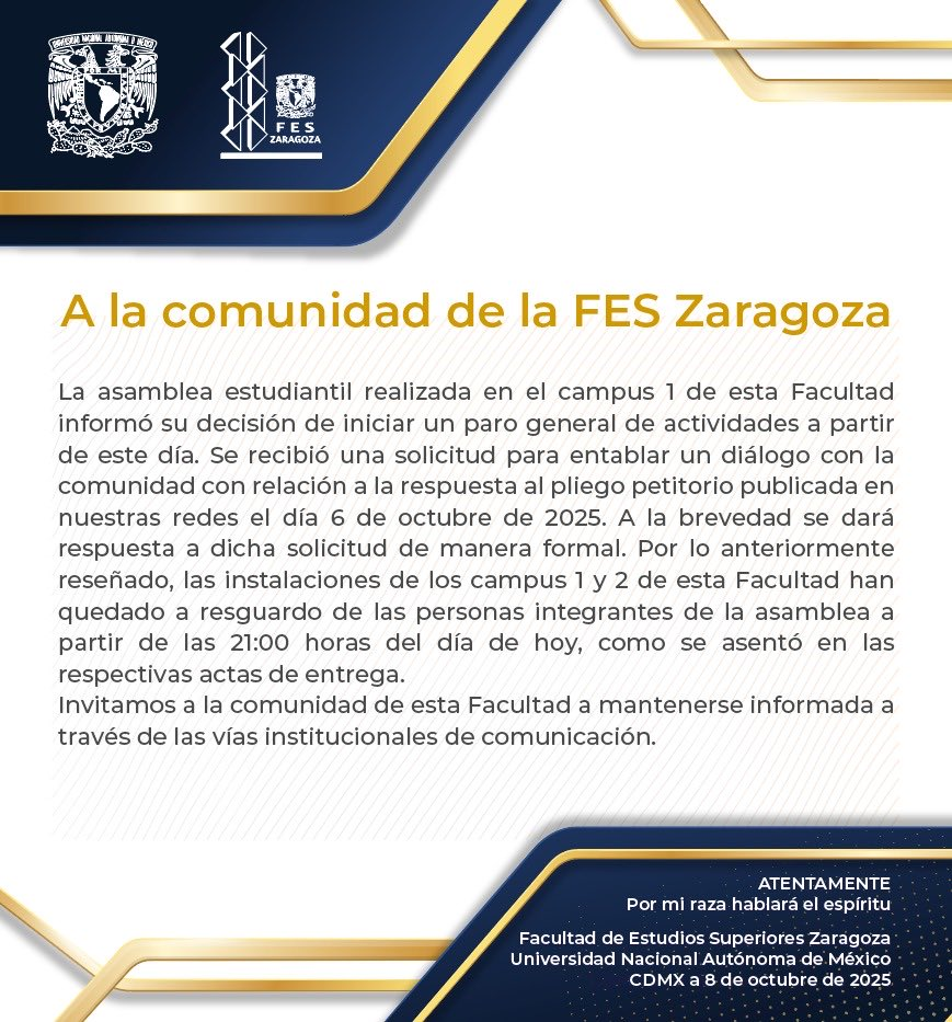 Posteriormente, los estudiantes organizaron una asamblea en torno a la falta de seguridad en el campus, cuya resolución, al cierre de esta edición y según un comunicado de la FES, fue la de un paro general de actividades a partir de hoy, por lo que las instalaciones quedaron a resguardo de los integrantes de la asamblea desde las 21:00 horas.