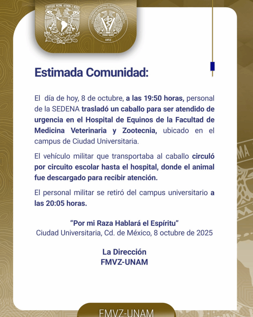 Según un comunicado emitido por la Facultad de Medicina Veterinaria y Zootecnia, alrededor de las 19:50 horas personal de la Sedena trasladó un caballo para ser atendido de urgencia en el Hospital de Equinos, ubicado en el campus de Ciudad Universitaria, por lo que el vehículo militar que transportaba al animal circuló por el Circuito Escolar hasta el hospital, donde fue entregado para recibir atención.