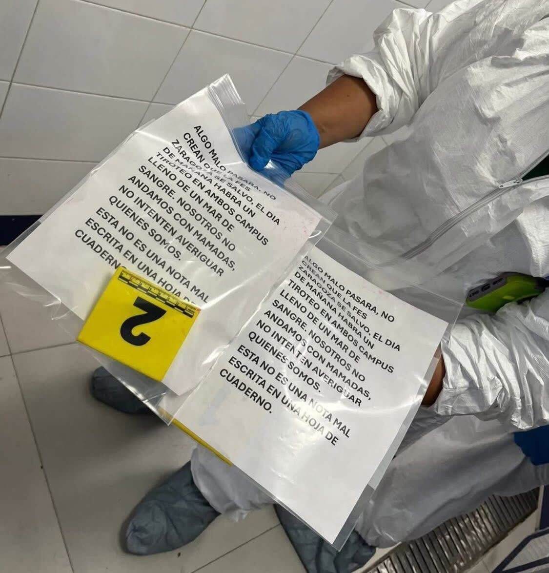 En la FES Zaragoza, la alarma se activó luego de que fueran hallados en un baño de mujeres carteles con amenazas contra la comunidad estudiantil sobre un presunto tiroteo, por lo que las autoridades resguardaron el área y peritos de la FGJCDMX realizaron trabajos de levantamiento de huellas para dar con los responsables.