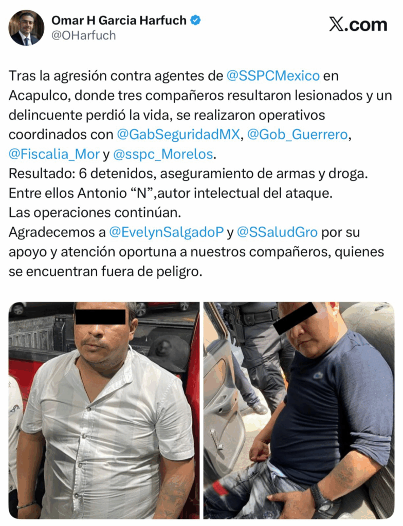 En una acción coordinada, elementos de la Secretaría de Seguridad y Protección Ciudadana (SSPC), Secretaría de la Defensa Nacional (Defensa), Secretaría de Marina (Semar), Fiscalía General de la República (FGR), Guardia Nacional (GN), junto con Policía Estatal de Guerrero, Fiscalía y Policía Estatal de Morelos, fueron detenidas seis personas vinculadas con una agresión hacia elementos de seguridad en Acapulco, Guerrero.