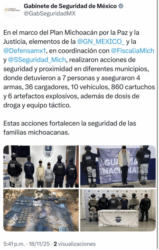 Con estas acciones, las instituciones del Gabinete de Seguridad refrendan su compromiso con la población de Michoacán, para el fortalecimiento de la seguridad en el estado.