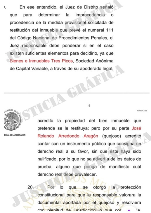 El Tribunal Colegiado ordenó la reposición del bien inmueble del señor Arredondo Aragón, sin embargo 3 días después de dicha orden, José Ramón Gómez Leal en un acto terrible de desacato e ilegalidad a través de un Notario gángster, celebró una compraventa con un documento de posesión falso promoviendo una nueva escritura.