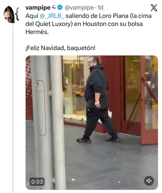 “Aquí @_JRLB_ saliendo de Loro Piana (la cima del Quiet Luxory) en Houston con su bolsa Hermès. ¡Feliz Navidad, baquetón!“, se lee en el post.