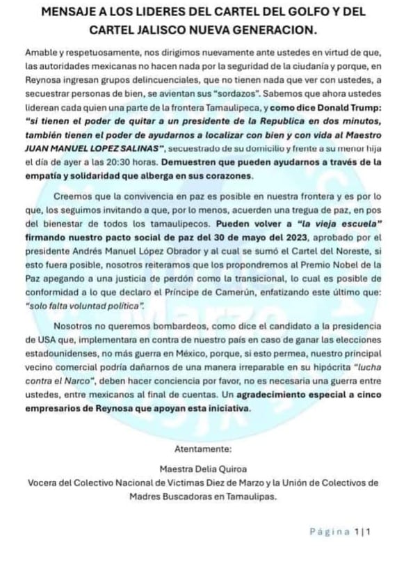 La activista Delia Quiroa, vocera del Colectivo Nacional 10 de Marzo y de la Unión de Madres Buscadoras de Tamaulipas, en un acto de valor cívico y empatía, solicitó ayer a los líderes de los cárteles Jalisco Nueva Generación y CDG que regresen al maestro Juan Manuel López Salinas, secuestrado en su casa frente a su pequeña hija de 4 años la noche del miércoles, en la colonia Aztlán, en Reynosa, Tamaulipas.