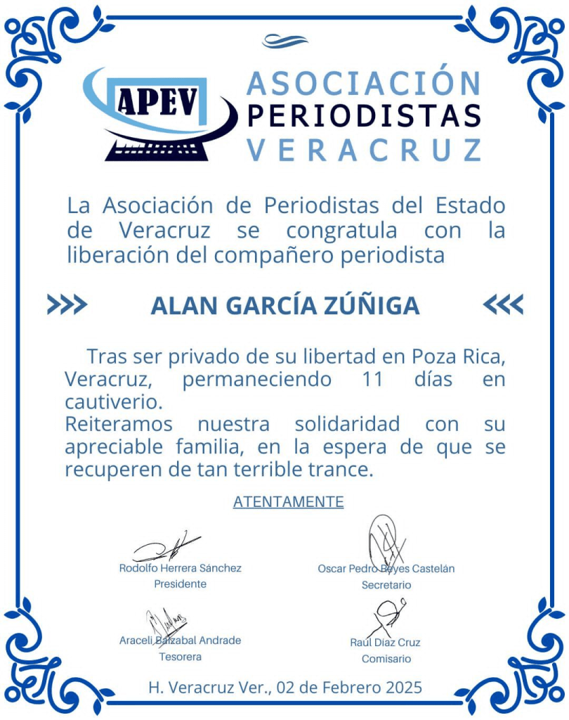 Entre los casos más recientes se encuentra el del periodista Alan García Zúñiga, quien fue secuestrado el 22 de enero de 2025 en Poza Rica, Veracruz. Cuando llegaba a su hogar después de una jornada en su segundo empleo como paramédico, Alan se percató de que un comando armado lo seguía y, aunque intentó evadirlos, fue finalmente secuestrado con lujo de violencia, según testigos. Afortunadamente, después de once días de cautiverio, fue liberado.