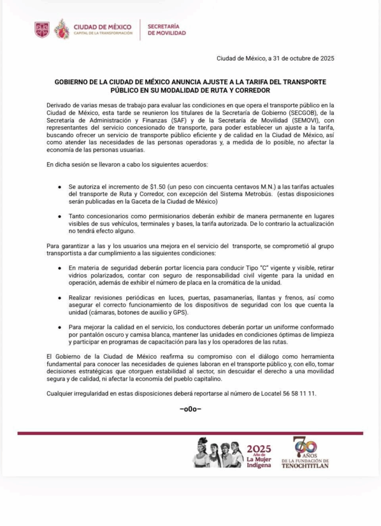 Este ajuste a la tarifa se acordó esta tarde en una reunión entre representantes del servicio concesionado de transporte y los titulares de la Secretaría de Gobierno (SECGOB), de la Secretaría de Administración y Finanzas (SAF) y de la Secretaría de Movilidad (Semovi), con el presunto objetivo de ofrecer un transporte público eficiente y de calidad en la CDMX, así como atender las necesidades de las personas operadoras: “y, a medida de lo posible, no afectar la economía de las personas usuarias”.